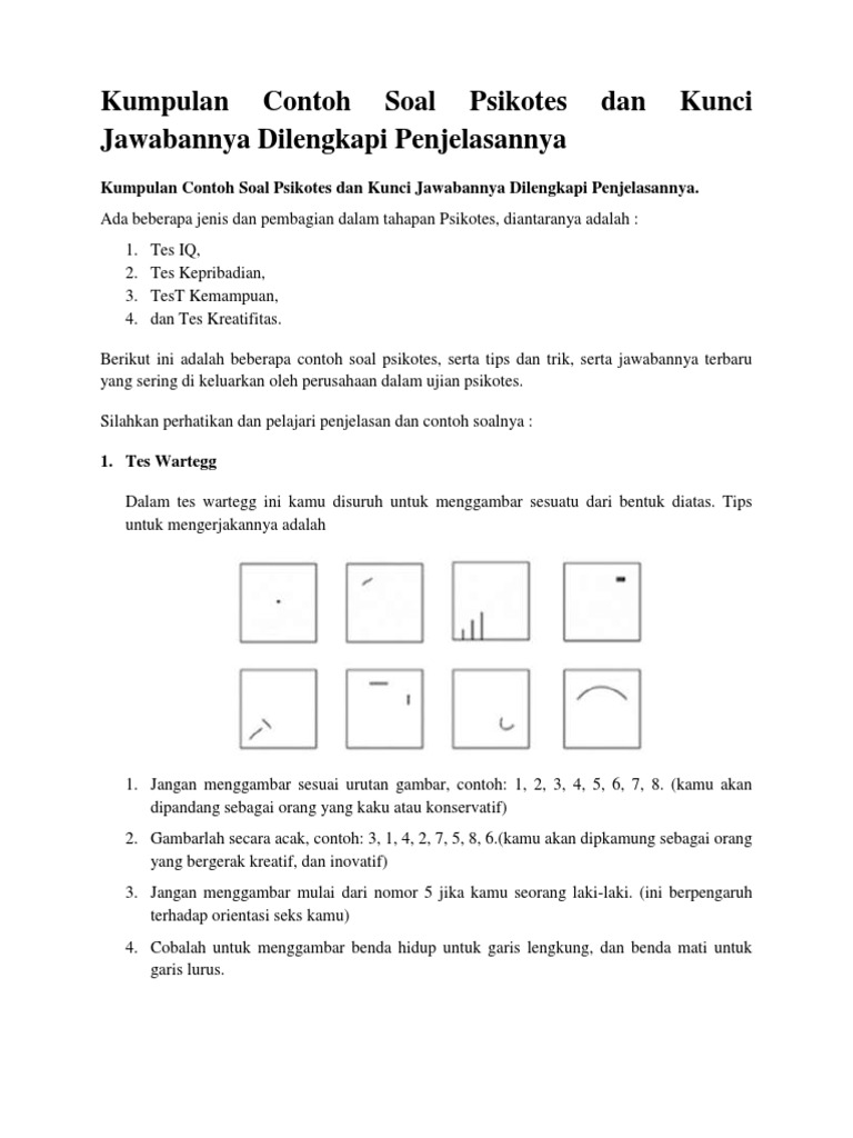Yang perlu anda ketahui tentang soal psikotest atau tes psikotes. Setiap perusahaan pasti membutuhkan pekerja yang berbeda dan untuk psikotest itu selain untuk liat kemampuan seseorang, juga untuk melihat mental, kecenderungan. Psikotes secara umum lebih menilai kepribadian peserta tes, sedangkan tpa mengukur kemampuan dan bakat. Contoh tes kepribadian dan jawabannya soal cerita psikotes kepribadian, baiklah berikut ini akan saya jabarkan beberapa contoh tes kepribadian dan jawabannya yang. Tes psikologi / tes psikotes adalah bagian penting psikologi untuk mengetahui sifat diri sendiri atau tes kepribadian asli seseorang. Adapun contoh soal yang dimaksud. Pembahasan soal psikotes kepribadian nomor 4. Apakah anda sering mengerjakan contoh soal psikotes? Kumpulan contoh soal psikotes mulai dari gambar orang, pohon, psikologi psikotes adalah salah satu tahapan seleksi kerja yang sering dipakai untuk merekrut pegawai. Download contoh soal psikotes 2019 matematika gambar polri bank karayawan deret kami akan jabarkan secara jelas dan detail mulai dari pengertian psikotes contoh serta. Psikotes, test kepribadian, test iq online, tes logika. Dapatkan contoh soal psikotest lengkap kumpulan soal soal psikotes yang bisa membantu untuk persiapan test masuk kerja ataupun test masuk. Berisi contoh soal psikotes online dan jawabannya untuk latihan.